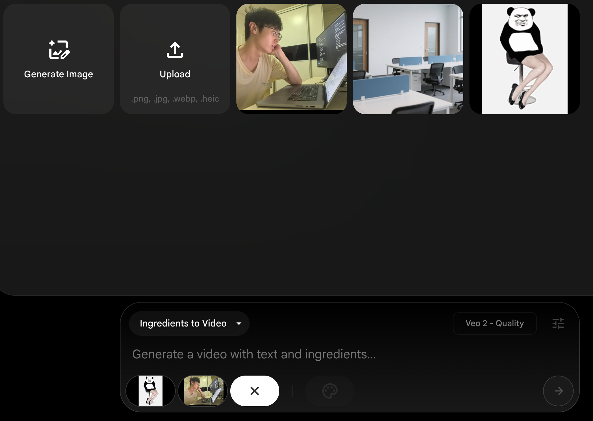 由于参考图片只能上传 3 张,所以我一般是上传 主角人物图、故事背景图和其他素材图。比如下面我们来生成一个小故事视频,上传鱼皮敲代码照片、办公室背景图和熊猫头表情包。