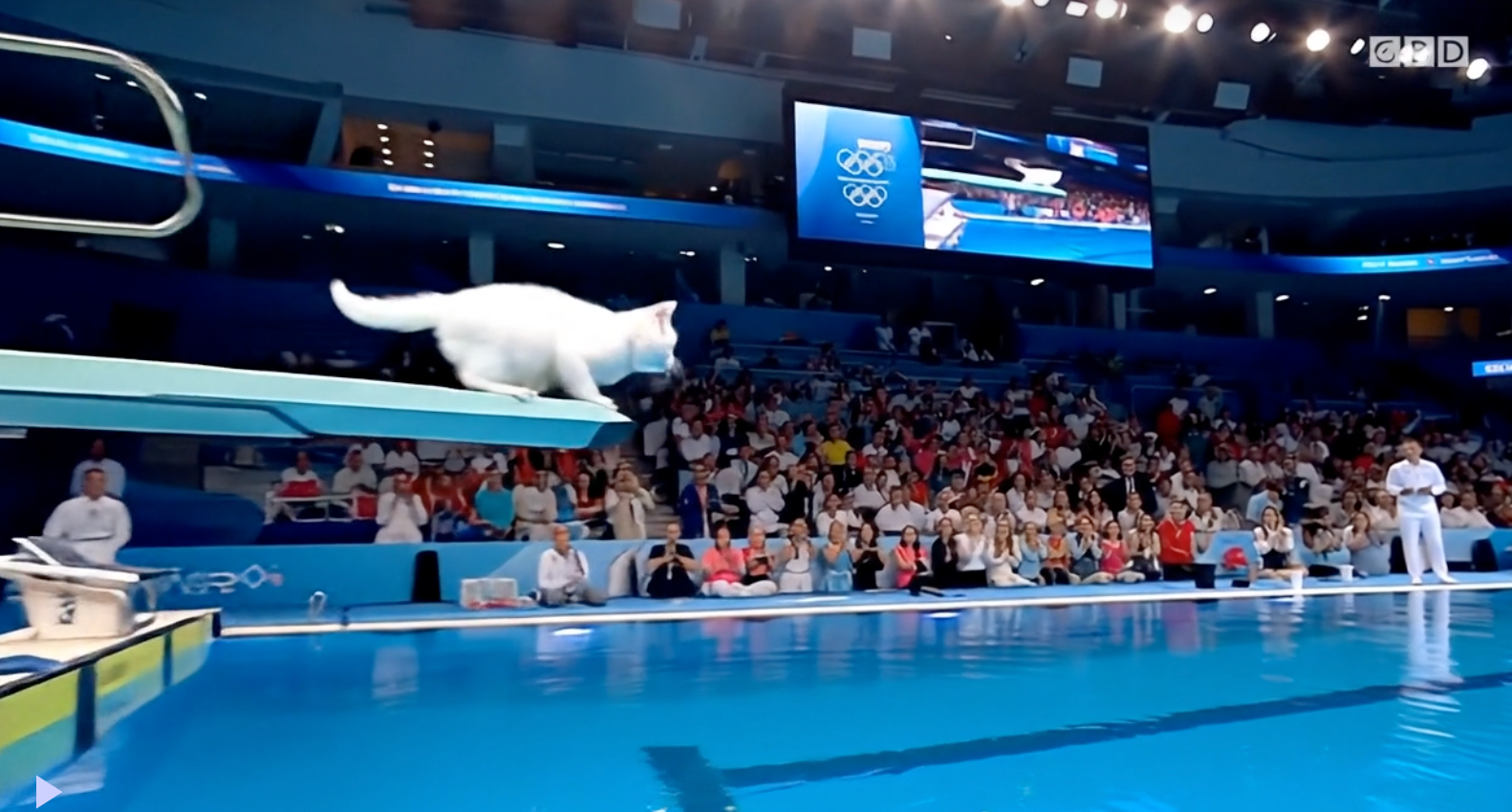 电视转播的奥运会跳水池,一只毛茸茸的小白猫从8米高的跳水板上纵身跳入游泳池,在空中做出优雅的翻转动作,四肢张开如同展翅飞翔,动作正常速度,不是慢动作。现场观众被这可爱的一幕逗得哈哈大笑,解说员也忍不住称赞"太萌了"。音效:轻柔的水花溅起声、观众的欢笑声和"哇"的惊叹声、解说员温馨幽默的解说声。