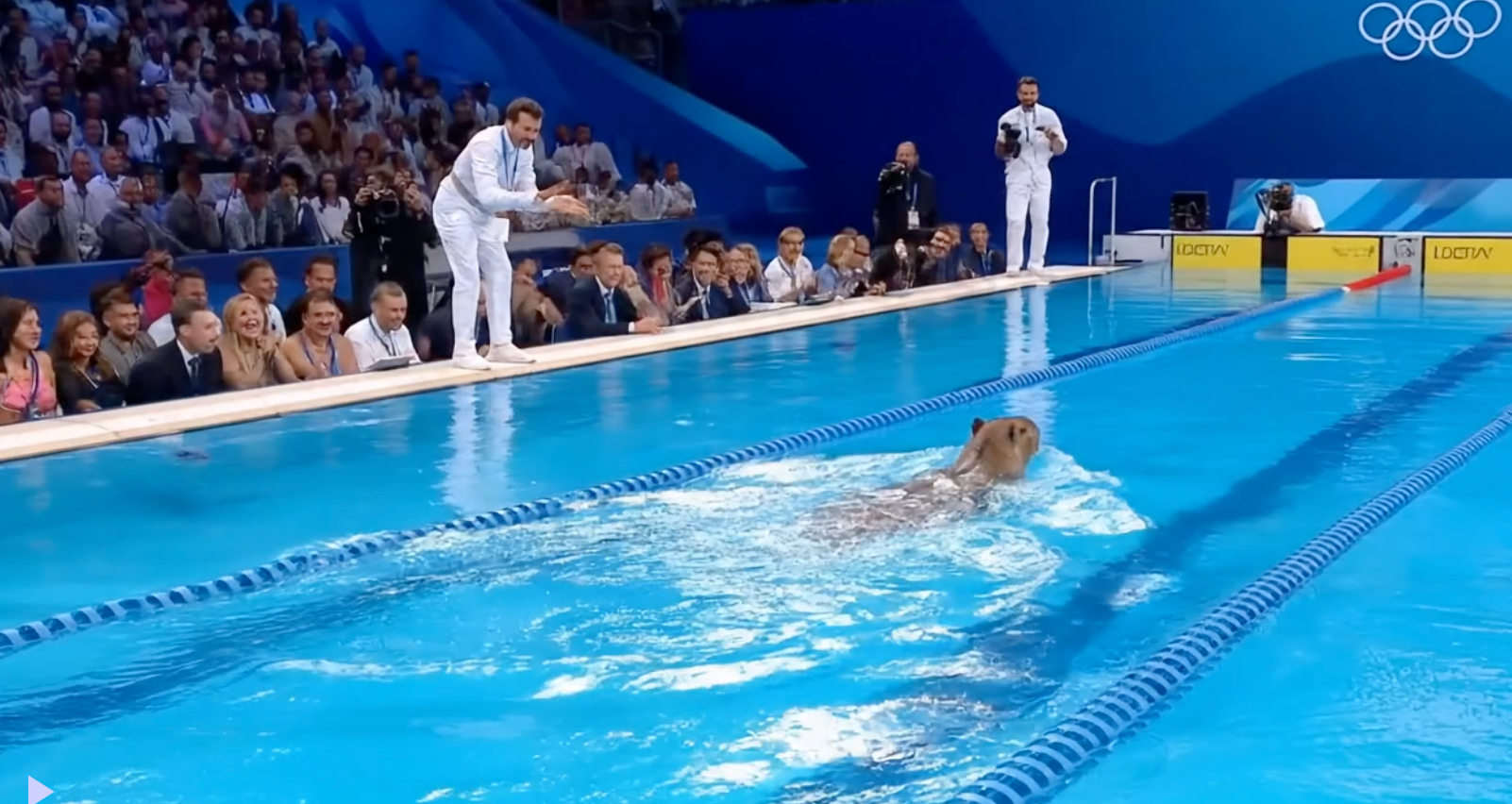 电视转播的奥运会游泳池,一只悠闲的卡皮巴拉正在进行自由泳比赛。它以极其淡定的表情和缓慢优雅的泳姿在水中前进,完全不受周围紧张气氛影响,仿佛在享受spa一般。现场观众被它的佛系态度逗乐,解说员惊叹于它的"zen游泳法"。音效:平缓的划水声、观众的轻笑声、解说员充满哲理的解说声。