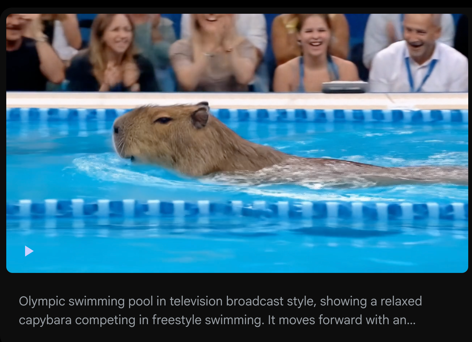 看下效果,我觉得比刚刚的小猫奥运会好多了,卡皮巴拉非常真实,动作也很自然。AI 目前还是更适合生成动作细节量小的内容,动作细节越多,越容易 “穿帮”。