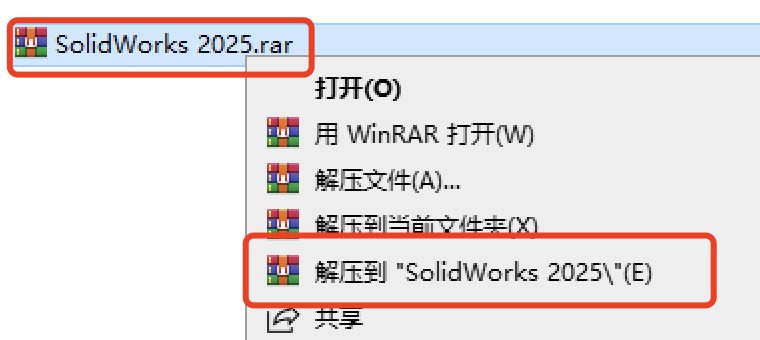 -解压安装包:找到下载好的 SolidWorks 2025 安装包,鼠标右键点击,选择 “解压到当前文件夹”,等待解压完成。
