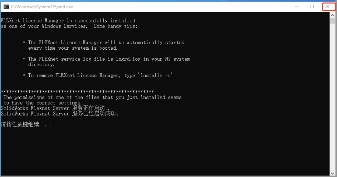 -启动服务程序:进入 C 盘的【SolidWorks_Flexnet_Server】文件夹,右键以管理员身份运行【server_install】程序。看到服务启动成功提示后,点击窗口右上角 “X” 关闭。
