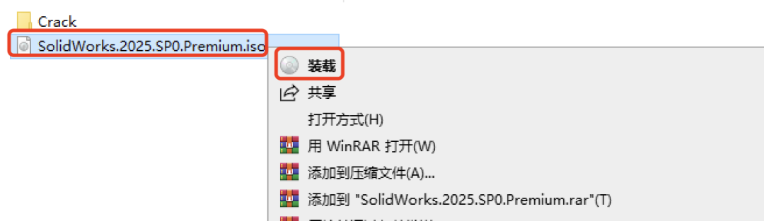 -装载镜像文件:右键解压后的【SolidWorks 2025】镜像文件,选择 “装载”;若没有 “装载” 选项,选择用 Windows 资源管理器打开。