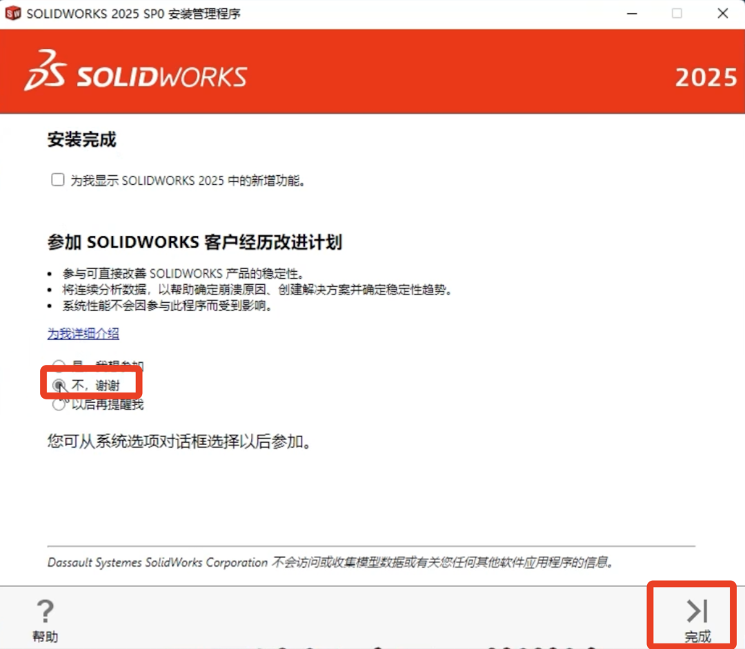 -完成安装:安装结束,取消勾选【为我显示……】,选择【不,谢谢】,点击 “完成”。