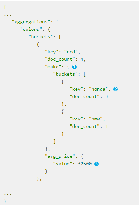 神奇吧~指标运算还包括其他,如最大、最小、求和、个数、地理坐标运算等。然而我们今天要进行实例讲解的则主要是Bucket Aggregation,桶聚合。桶聚合是指把文档,按照某个给定字段分成不同的组,然后在组内进行进一步聚合运算,并返回桶级的结果。比较直观的理解,如:直方图、分时间段统计等等。如下面这个例子,是桶聚合中的term聚合,即按照color这个字段,精确匹配后进行分桶,然后桶内还进一步嵌套了平均价格聚合、和按制造商进一步的分桶聚合。