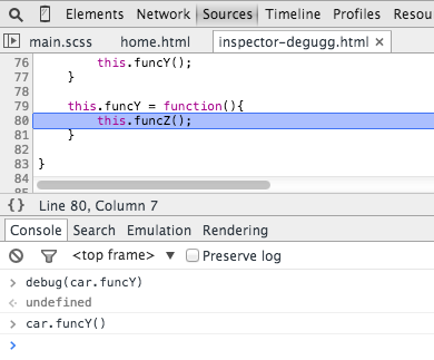 不过这两种方法都存在一个小问题就是都要到对应的脚本文件中然后再找到对应的行,这样会比较麻烦。这边介绍一个相对快捷点的方法,就是在console中使用debug(funcName)然后脚本会在指定到对应函数的地方自动停止。这种方法有个缺陷就是无法在私有函数或者匿名函数处停止,所以还是要因时而异: