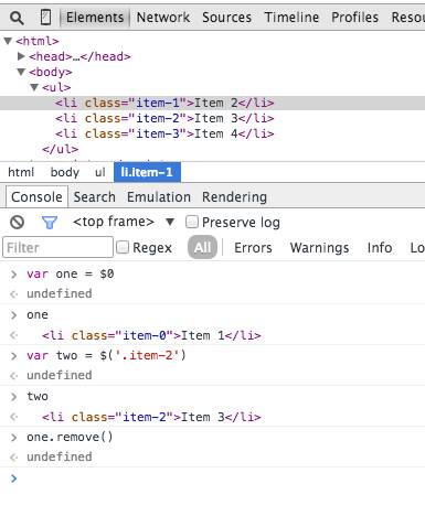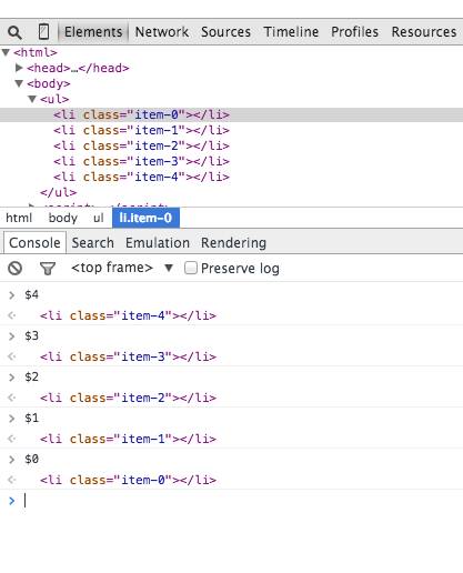 在Elements选择面板中选择某个DOM元素然后在Console中使用该元素也是非常常见的一个操作,Chrome Inspector会缓存最后5个DOM元素在它的历史记录中,你可以用类似于Shell中的$0等方式来快速关联到元素。譬如下图的列表中有‘item-4′, ‘item-3’, ‘item-2’, ‘item-1’,‘item-0’这几个元素,你可以这么使用: