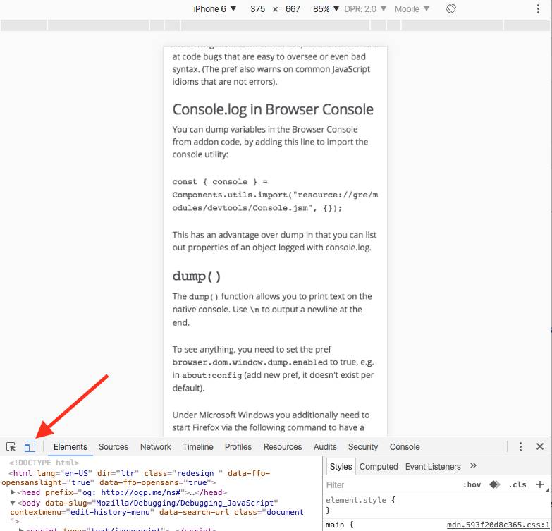 Chrome有一个非常诱人的功能就是能够模拟不同设备的尺寸,在Chrome的Inspector中点击toggle device mode按钮,然后就可以在不同的设备屏幕尺寸下进行调试咯: