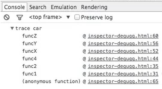 JavaScript框架极大方便了我们的开发,但是也会带来大量的预定义的函数,譬如创建View的、绑定事件的等等,这样我们就不容易追踪我们自定义函数的调用过程了。虽然JavaScript不是一个非常严谨的语言,有时候很难搞清楚到底发生了啥,特别是当你需要审阅其他人的代码的时候。这时候console.trace就要起作用咯,它可以帮你进行函数调用的追踪。譬如下面的代码中我们要追踪出car对象中对于funcZ的调用过程: