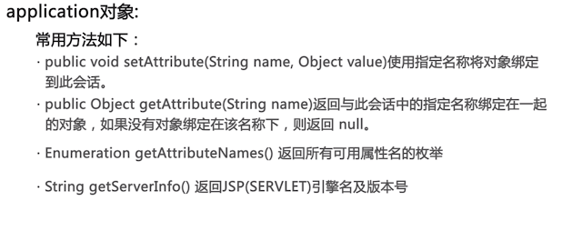 - 实现了用户之间的信息共享,存放全局变量。开始于服务器启动,终止于服务器关闭。是Servlet类的实例。