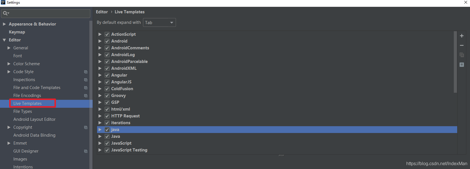 依次打开File----->Settings------>Editor------>Live Templates,点击右侧+,新建Template Group:Java