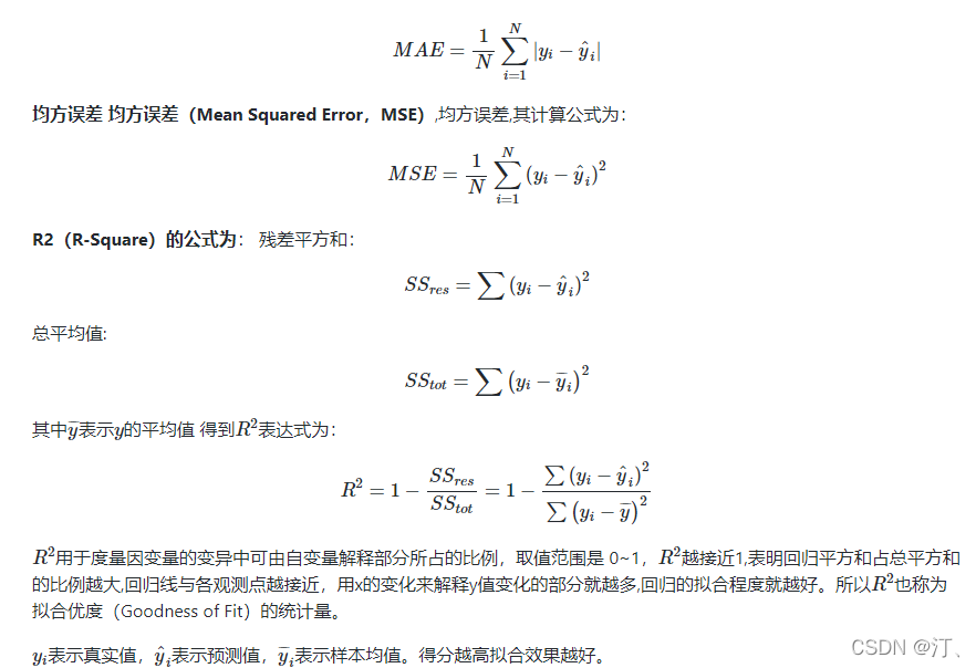 - 平均绝对误差(Mean Absolute Error,MAE),均方误差(Mean Squared Error,MSE),平均绝对百分误差(Mean Absolute Percentage Error,MAPE),均方根误差(Root Mean Squared Error), R2(R-Square)
