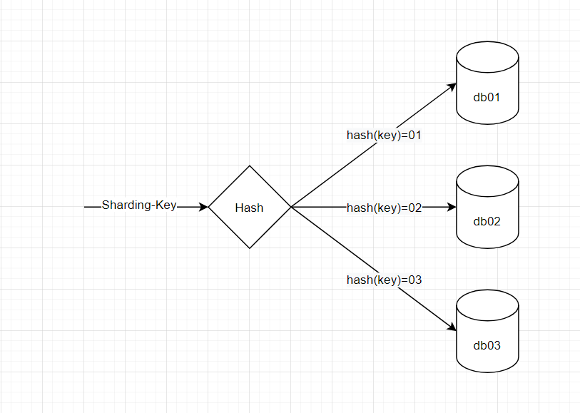 哈希路由,即对分片的键值,进行哈希,然后根据哈希结果,对应到一个具体的数据库。比如,键值为 1000,对其取哈希的结果为 01,则存储到 db01 这个数据库,如下图所示: