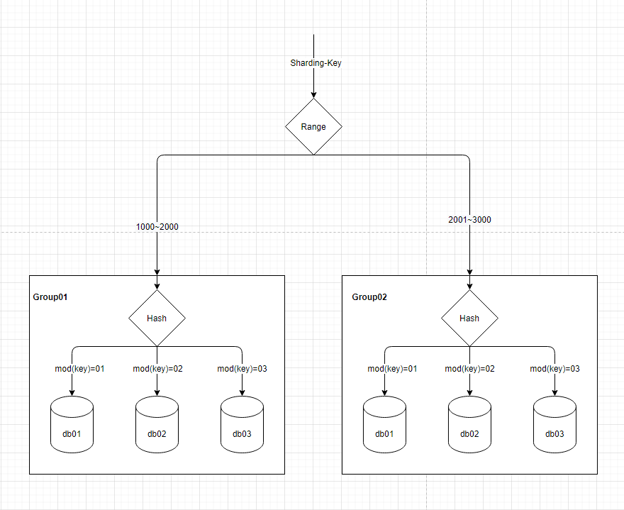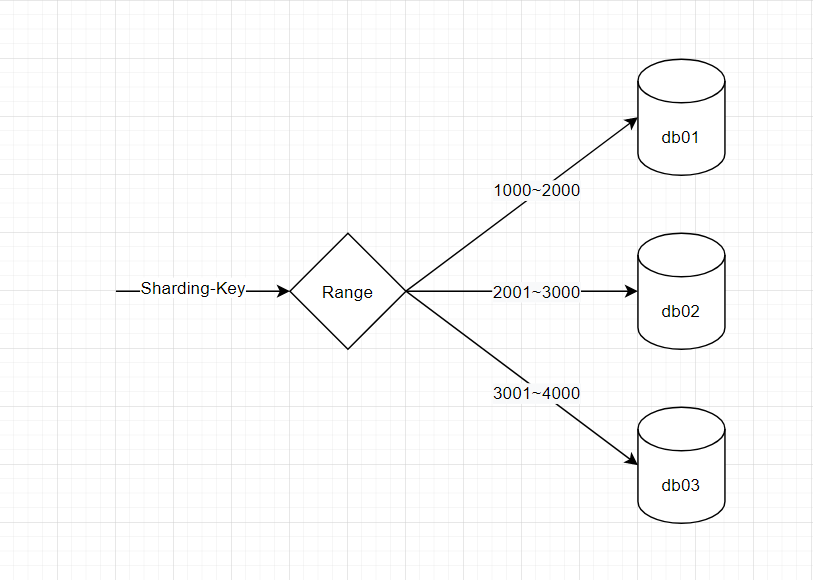 分组路由,即对分片的键值,进行分组,每组对应到一个具体的数据库。比如,键值为 1000 到 2000,则存储到 db01 这个数据库,如下图所示:
