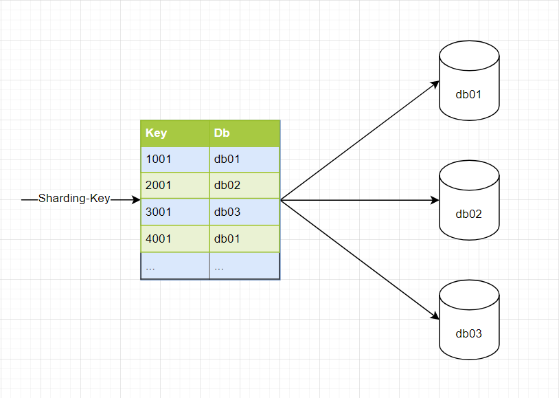 映射路由,即新增一个库,新建一个路由映射表,存储分片键值和对应的库之间的映射关系。比如,键值为 1001,映射到 db01 这个数据库,如下图所示: