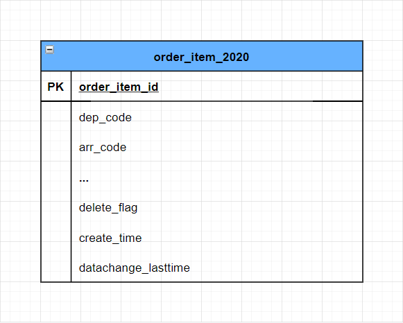 为了建立分库分表下的关联关系,和更加合理有效的结构,我们新申请了订单分库分表的几个库,设计了一套全新的表结构。表名以年份结尾、规范化表字段、适当增删了部分字段、不使用自增主键关联,采用业务唯一键进行关联等。表结构示例如下图: