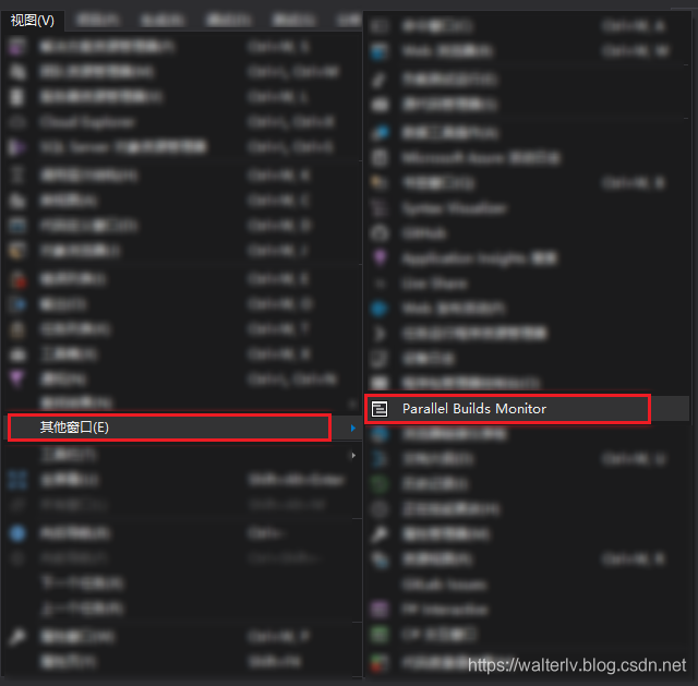 之后启动 Visual Studio 2019,你就能在 “其他窗口” 中找到 “Parallel Builds Monitor” 窗口了。请点击打开它。