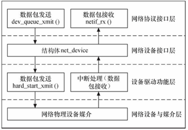 1. 网络协议接口层:用于实现统一的数据包收发的协议,通过dev_queue_xmit()函数发送数据, 通过netif_rx()函数接收数据