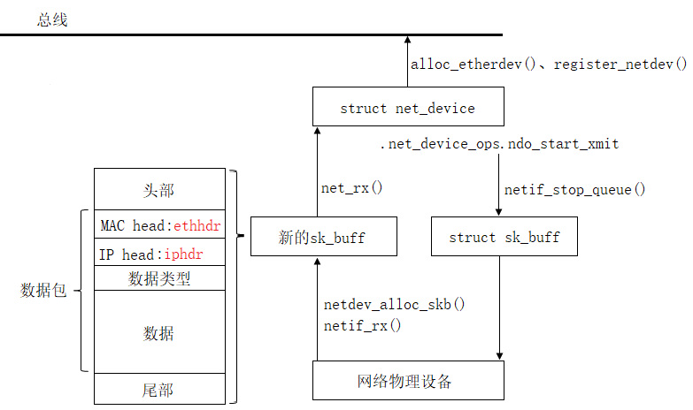 3. 设备驱动功能层:同于驱动网络设备实现各个功能,通过hard_start_xmit()函数发送数据,通过网络设备上的中断函数接收数据