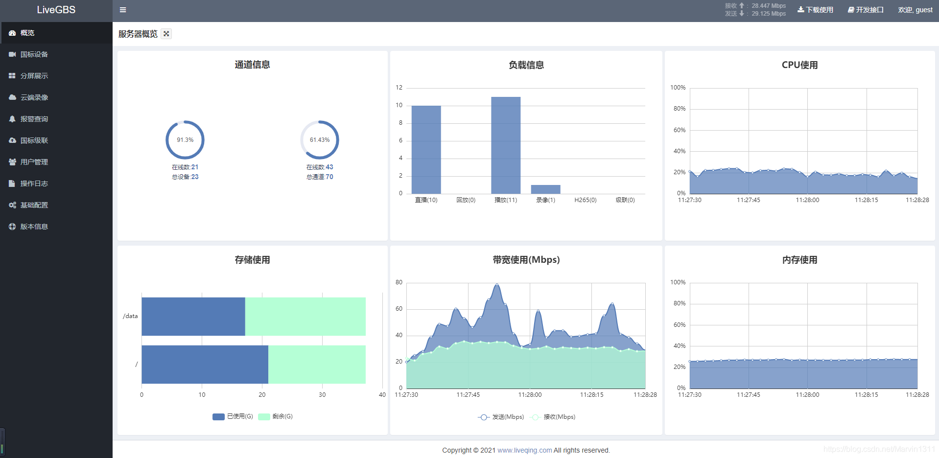 目前市面上各类监控设备(摄像头、录像机、监控管理平台)等基本都支持GB28181协议。当设备通过GB28181统一汇聚到LiveGBS流媒体视频平台后,LiveGBS管理页面会管理所有接入进来的监控视频以及服务器硬件、网络状态的维护。下面大概介绍下LiveGBS管理页面中概览页面的内容: