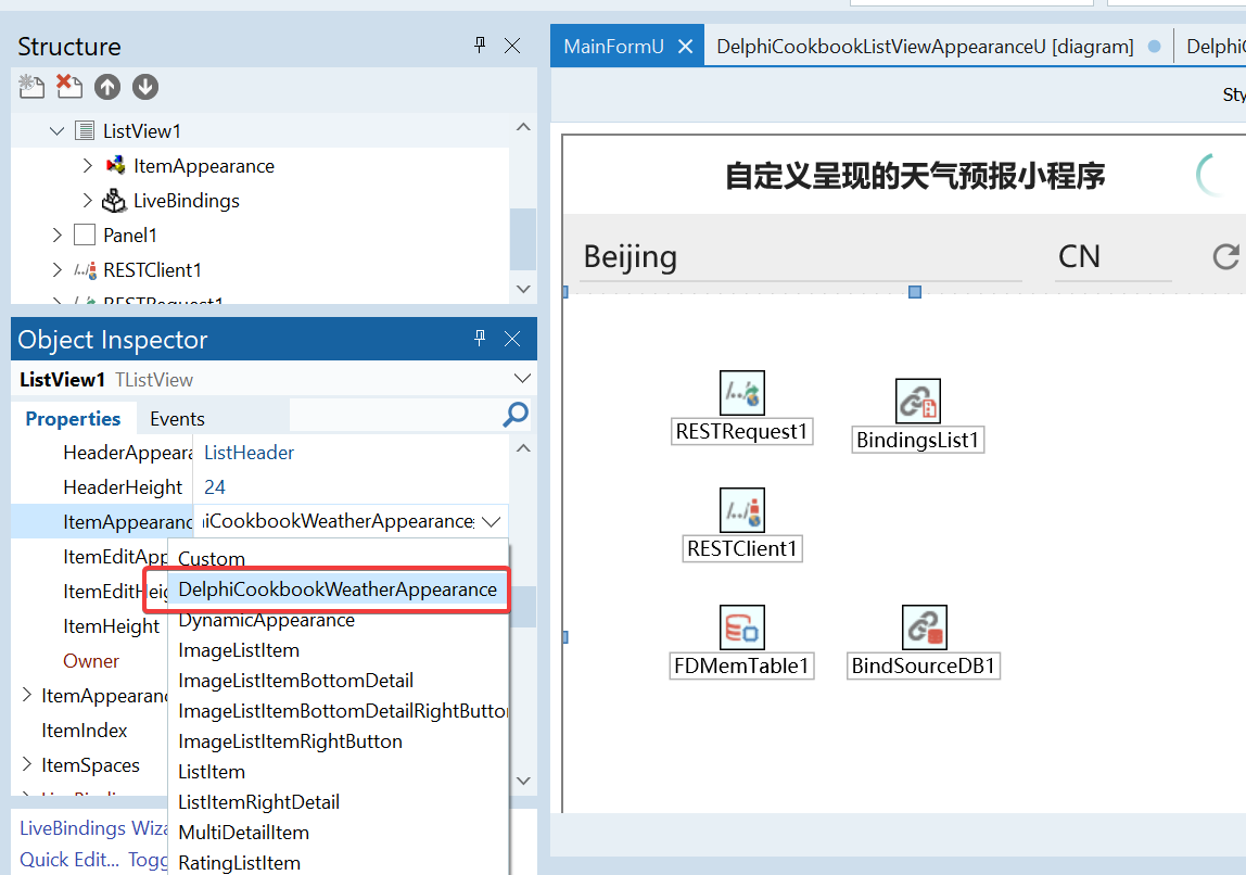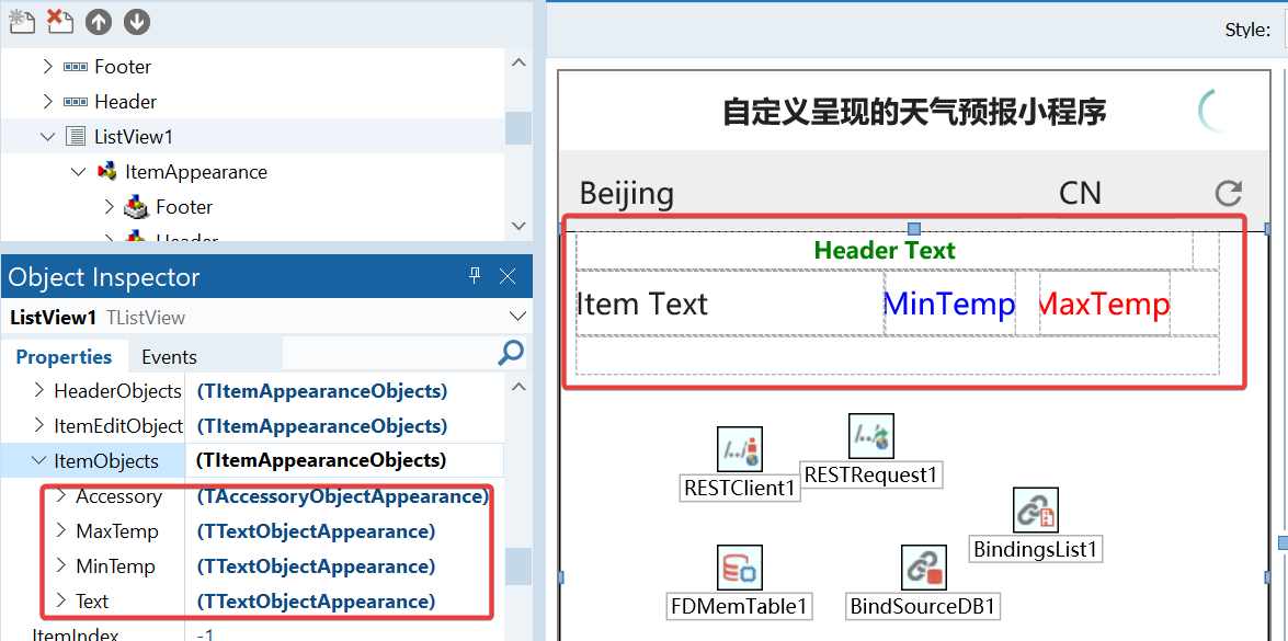 本节内容是《一步一步学习使用LiveBindings(14)》中天气预报小程序的进一步优化。虽然编写代码创建TListView的列表项可以提供较大的灵活民生,但是造成代码复杂性增加,而且可重用性较弱。