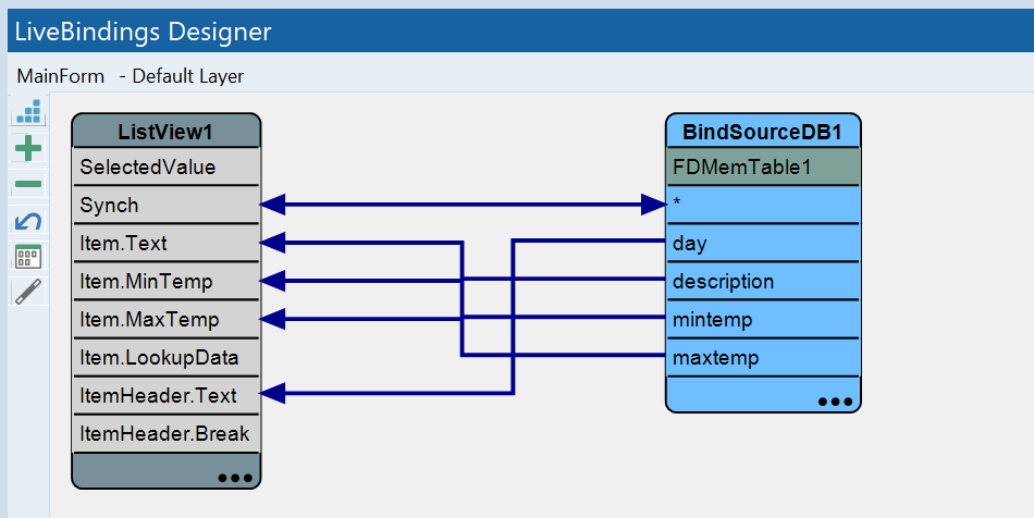 现在单击事件处理代码并不负责ListView的显示工作,而是交给LiveBindings实现了这一切,下图是LiveBindings Designer上添加的绑定效果: