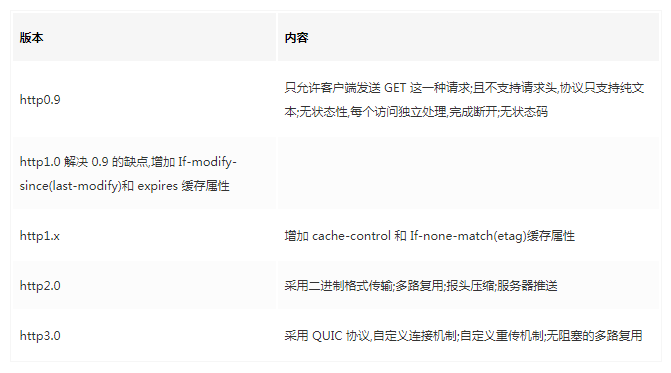 注意 expires 是响应头内容,返回一个固定的时间,缺陷是时间到了服务器要重新设置; 请求头中如果有 If-Modified-Since,服务器会将时间与 last-modified 对比,相同返回 304; 响应对象以一个响应状态行开始; 响应对象不只限于超文本; 支持 GET、HEAD、POST 方法; 有状态码; 支持长连接(但默认还是使用短连接)、缓存机制以及身份认证。