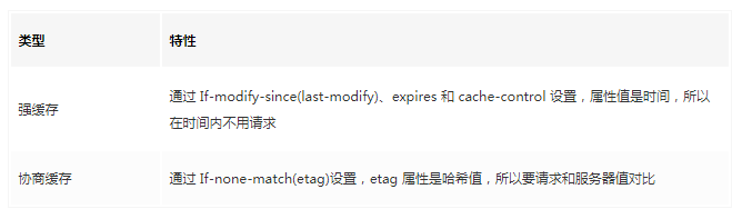 2.按缓存分:强缓存和协商缓存:2.1 强缓存:利用 cache-control 和 expires 设置,直接返回一个过期时间,所以在缓存期间不请求,If-modify-since;2.2 协商缓存:响应头返回 etag 或 last-modified 的哈希值,第二次请求头 If-none-match 或 IF-modify-since 携带上次哈希值,一致则返回 304。
