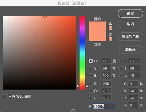•右边的彩虹带就可以选择色调 Hue,拖动彩虹带的箭头位置就可以调整 Hue 的值。•左边的正方形就和饱和度 Saturation、明度 Brightness 有关,横坐标表示饱和度 Saturation,纵坐标表示 Brightness,从左到右,饱和度 Saturation 变高,从下到上,明度 Brightness 变高。•左下角,由于饱和度 Saturation 和明度 Brightness 都为 0,就呈现黑色。•左上角,由于饱和度 Saturation 为 0,所以相当于没有颜色,颜色最浅,但是它的明度 Brightness 达到了最高,所以它就显示没有颜色的明度最高的色,即白色。•右上角,由于饱和度 Saturation 和明度 Brightness 都为最高,那就显示最纯的 Hue 值。