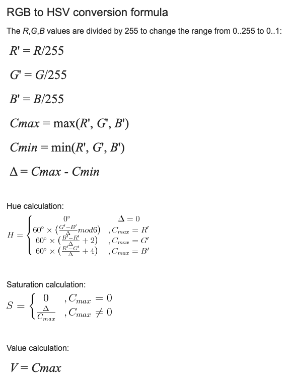 大家如果感兴趣想要研究的话也可以去:https://www.rapidtables.com/convert/color/hsv-to-rgb.html 来了解一下详情,这里还有详细的转换表格以及实时转换实现。