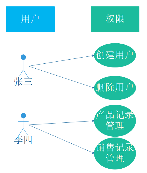 想到权限控制,人们最先想到的一定是用户与权限直接关联的模式,简单地说就是:某个用户具有某些权限。如图:
