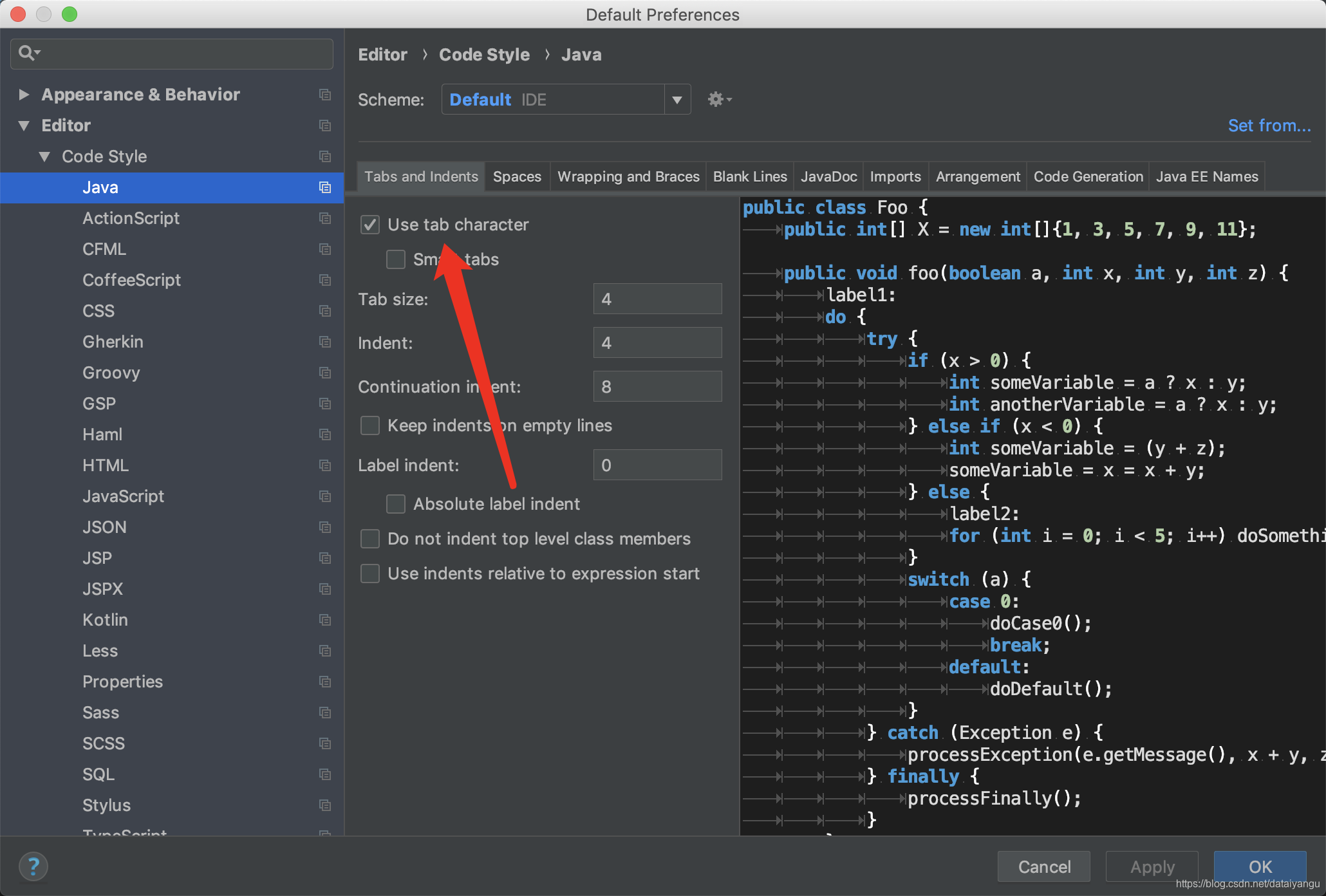 根据阿里巴巴Java开发手册,不能使用Tab字符,改成4个字符,设置如下: 注意:是不选择! 一定要选择这个: