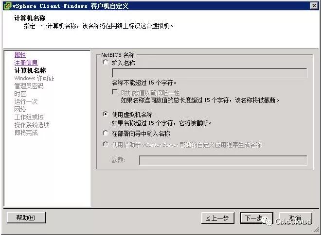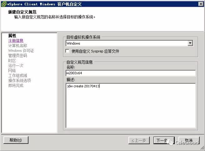 若要实现脚本完成虚拟机IP配置,需使用自定义规范。通过vcenter client【视图】-【管理】-【自定义规范管理器】-创建自定义规范。以win2003 x64为例,创建步骤如下: