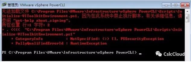 安装后,运行PowerCli,提示:“无法加载文件c:programFilesvmwareinfrastructurevspherepowerCLIscriptinitialize-vitoolkitenviroment.ps1,因为在此系统中禁止执行脚本。有关信息,请查阅“get-help about_signing”。