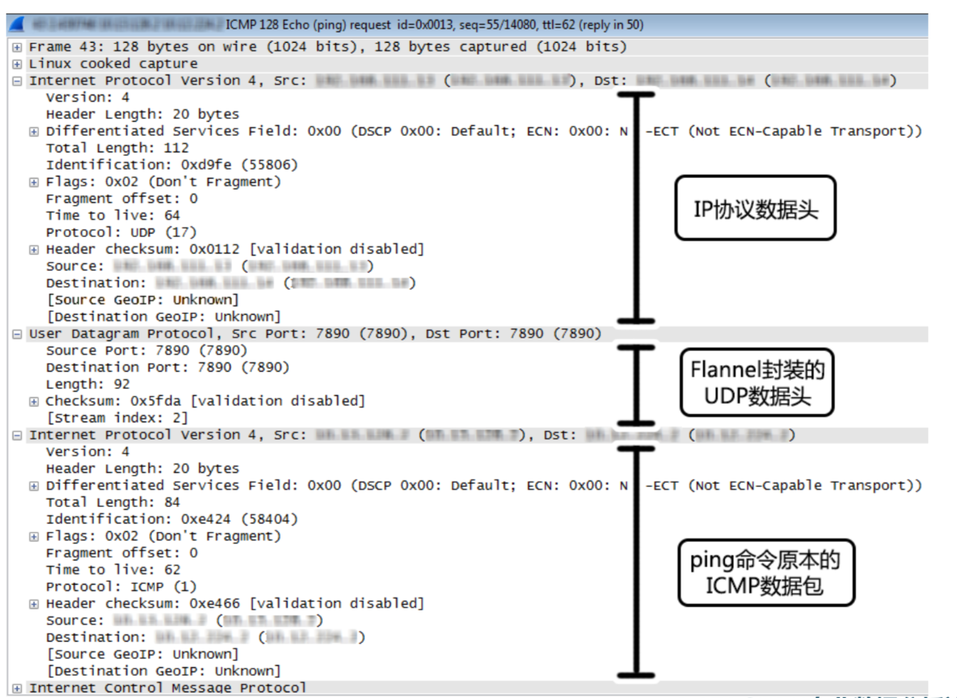原始数据是在起始节点的 Flannel服务上进行UDP封装 的,投递到目的节点后就被 另一端的Flannel服务还原成 了原始的数据包,两边的 Docker服务都感觉不到这个 过程的存在。