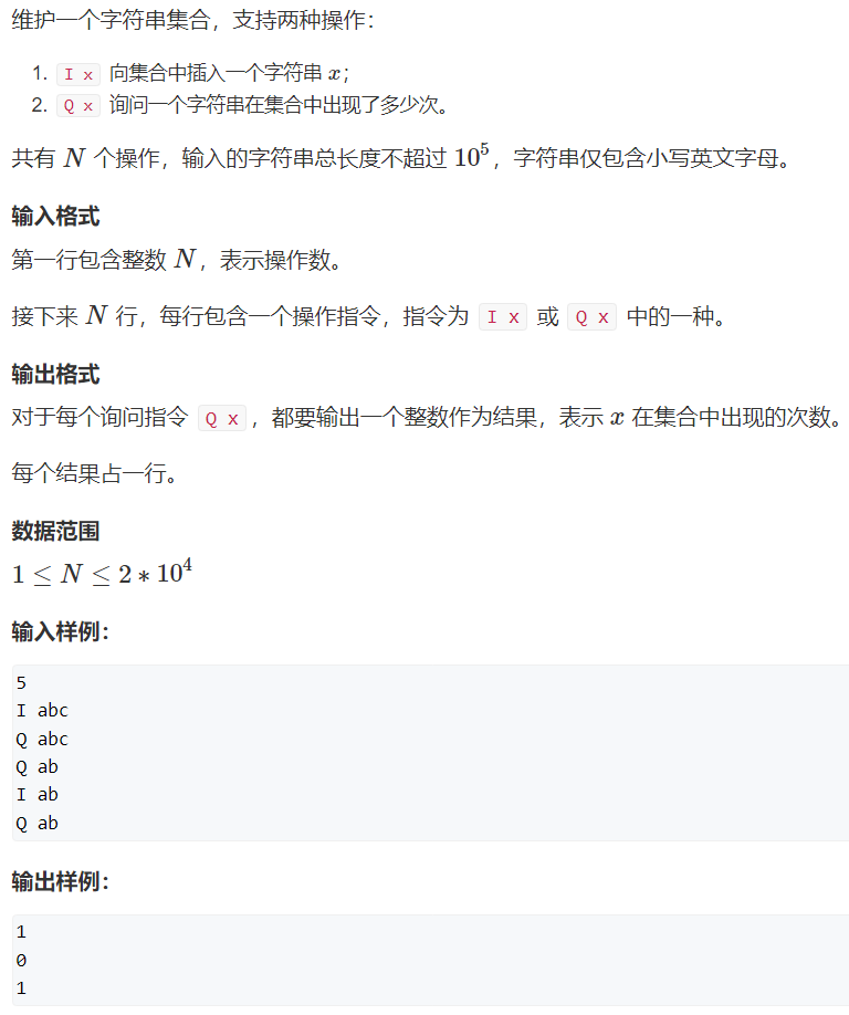 题目链接:传送门 描述给定 $N$ 个字符串 $S_1,S_2,\cdots,S_N$,接下来进行 $M$ 次询问,每次询问给定一个字符串 $T$,求 $S_1 \sim S_N$ 中有多少个字符串是 ...