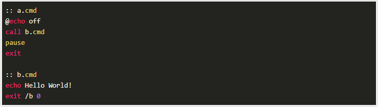 首先我们要分清楚调用方(Caller)和被调用方(Callee)。我们先假定两个文件:a.cmd和b.cmd,它们的代码分别如下: