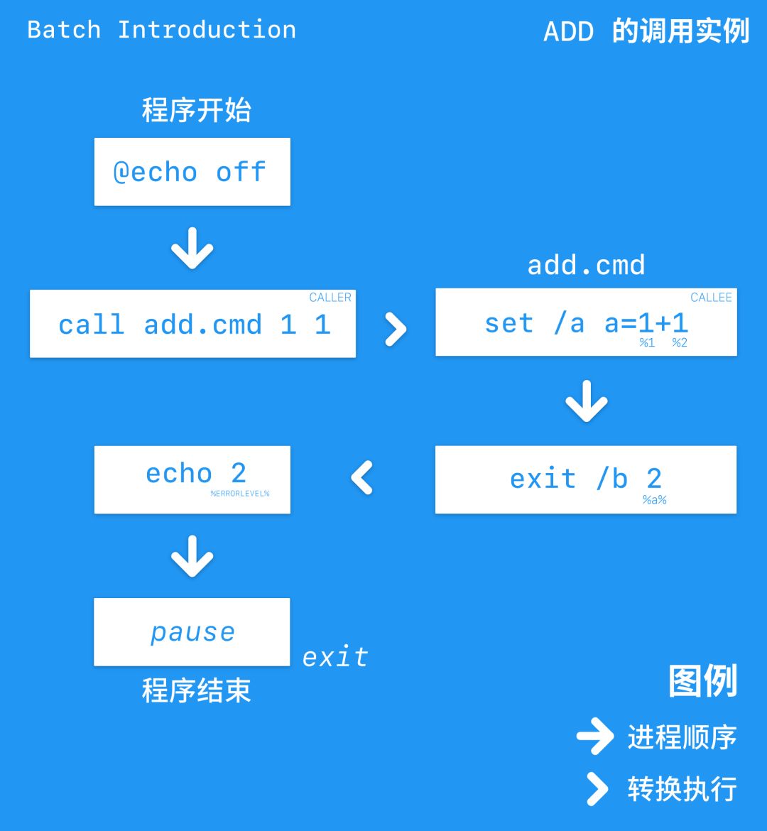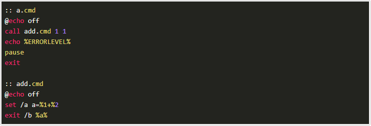 也就是说我们传递给add.cmd的两个参数1, 1经过add.cmd内的一行指令set /a a=%1+%2的操作,将它们两个加起来的值赋给了a,然后再用a当作exitCode 使用exit /b %a% 将a的值传回a.cmd的%ERRORLEVEL%里,最后a.cmd输出它的值。这就是1+1的结果。