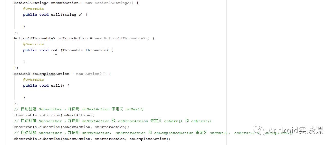 除了 subscribe(Observer) 和 subscribe(Subscriber) ,subscribe() 还支持不完整定义的回调,RxJava 会自动根据定义创建出 Subscriber 。形式如下: