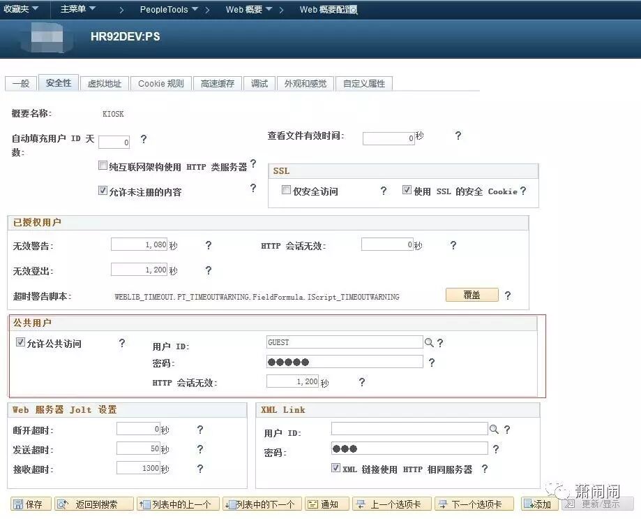 在PS系统中可以创建多个web概要,你可以通过不同的web概要来让用户路由到一个特定的web概要来控制超时,外观,缓存设置等。例如,通过PeopleSoft实现招聘解决方案,访问系统的有可能有3类人,HRMS核心用户,寻找工作机会的内网用户,寻找工作机会的互联网用户。可以提供不同的web概要给这三类人来控制页面展示和超时时间等(还没这么用过)。