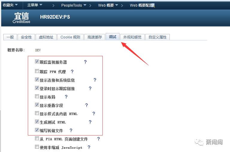 DEV web profile为来发提供了预先配置的基本门户功能,包括用于开发的跟踪和调试设置。例如:如果你打开DEV的 profile并且打开调试页签,会看到勾选的选项只在dev中启用,在其他概要中没有启用。如图: