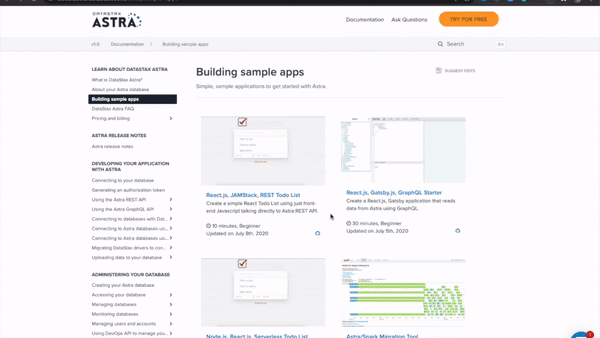 新上线的Astra示例程序库提供了基于多种编程语言和框架使用Astra的例子。借助这个示例程序库,你可以在短时间内建构起数据库、创建多个表、装载示例数据并部署基于Cassandra的应用程序。