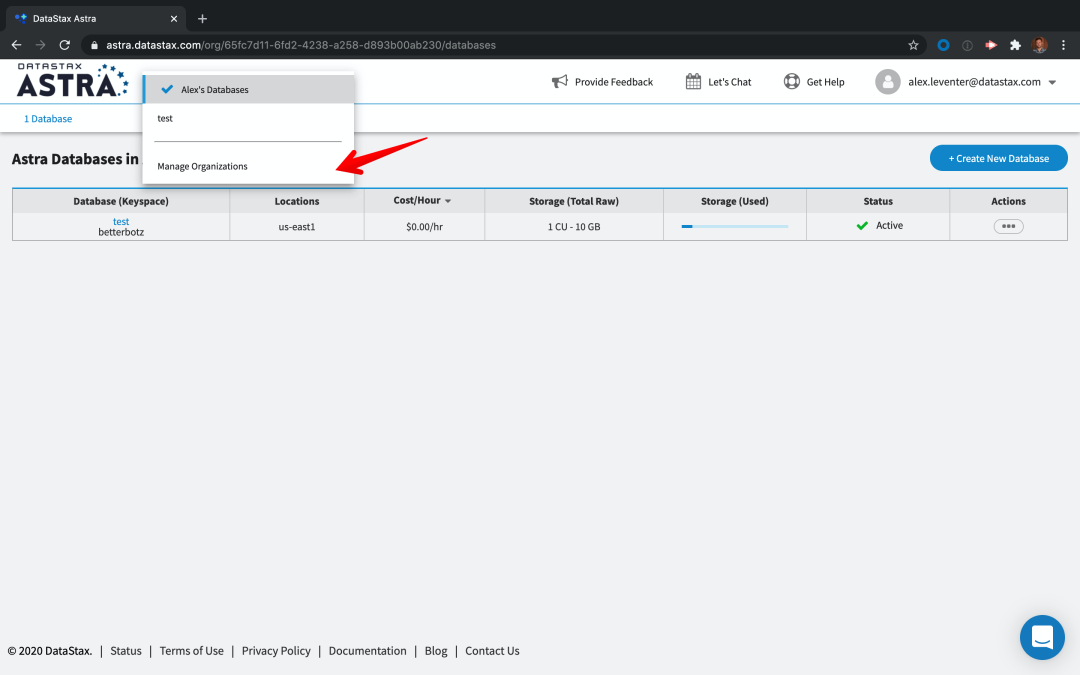 当你建立好你的数据库,在上方导航栏中找到并点击“Your Databases”,之后再点击“Manage Organizations”。