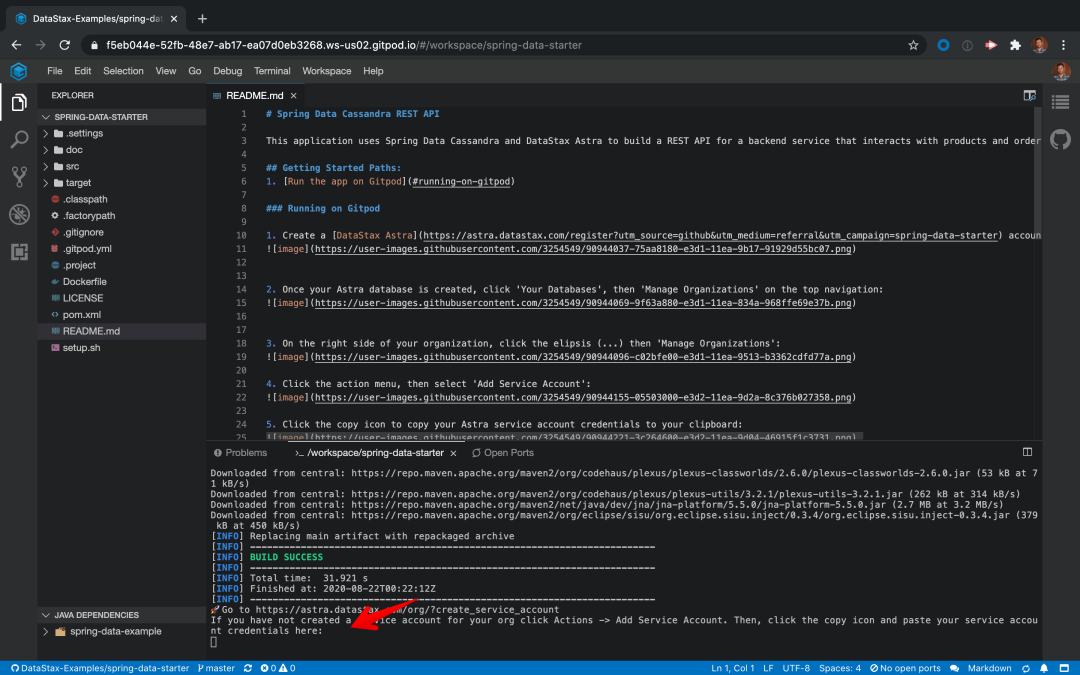登录你的Gitpod账户,当你的Gitpod workspace加载完成之后,系统会要求你在Gitpod命令行窗口的最底部粘贴你的服务账户证书。