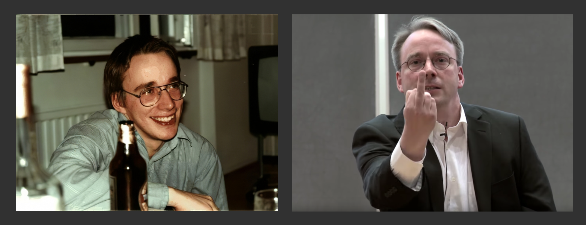 首先了解一下Linux是什么。它是一套类UNIX的操作系统,最初是1991年由芬兰人 Linus Torvald 在赫尔辛基大学读大二时出于个人爱好而编写的(不禁对大神无比的崇拜)。下面那张图左边是他年轻时的样子(年轻时也是小鲜肉一枚);右边是他现在的样子(也已经变成了中年大叔),而且 Linus不仅是个技术大神,还是著名的嘴炮,比如下面这些技术和应用都曾经被他喷过。