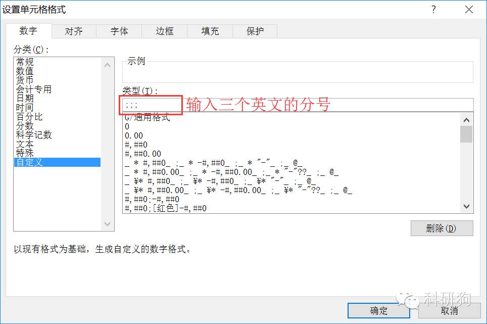 5. 在弹出的对话框内,选择数字——自定义,在类型中输入三个英文的分号.