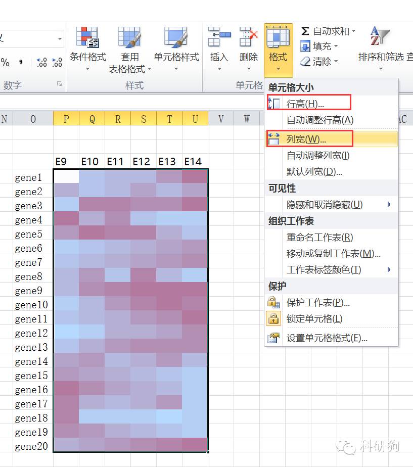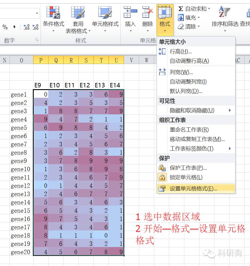 4. 怎么样,已经有热力图的基本样式了吧,我们需要把文字隐藏掉。首先选择数据区域,然后执行 开始—格式—设置单元格格式: