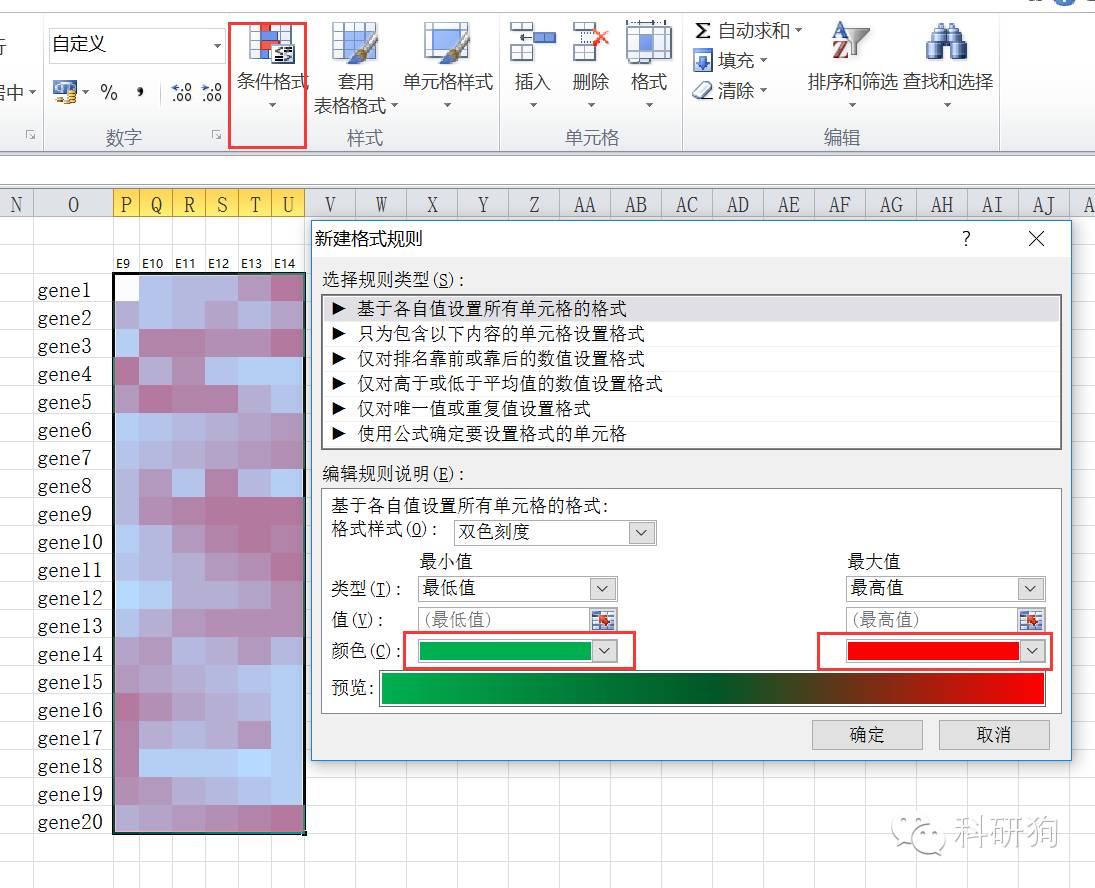 2. 选中表达数据,执行 开始—条件格式—色阶 选择一个合适的色阶: