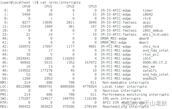 计算机当前各种中断响应情况在/proc/interrupts文件中。